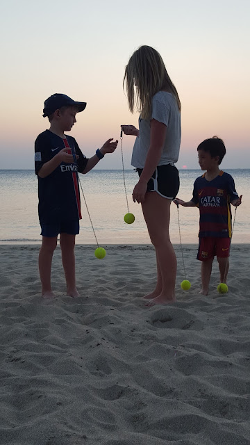 Tova och Maja, döttrarna i en annan vänfamilj, tränade för attdeltaga i en eldshow. De var så snälla och undervisade våra barn med betydligt snällare bollar än eldklot.